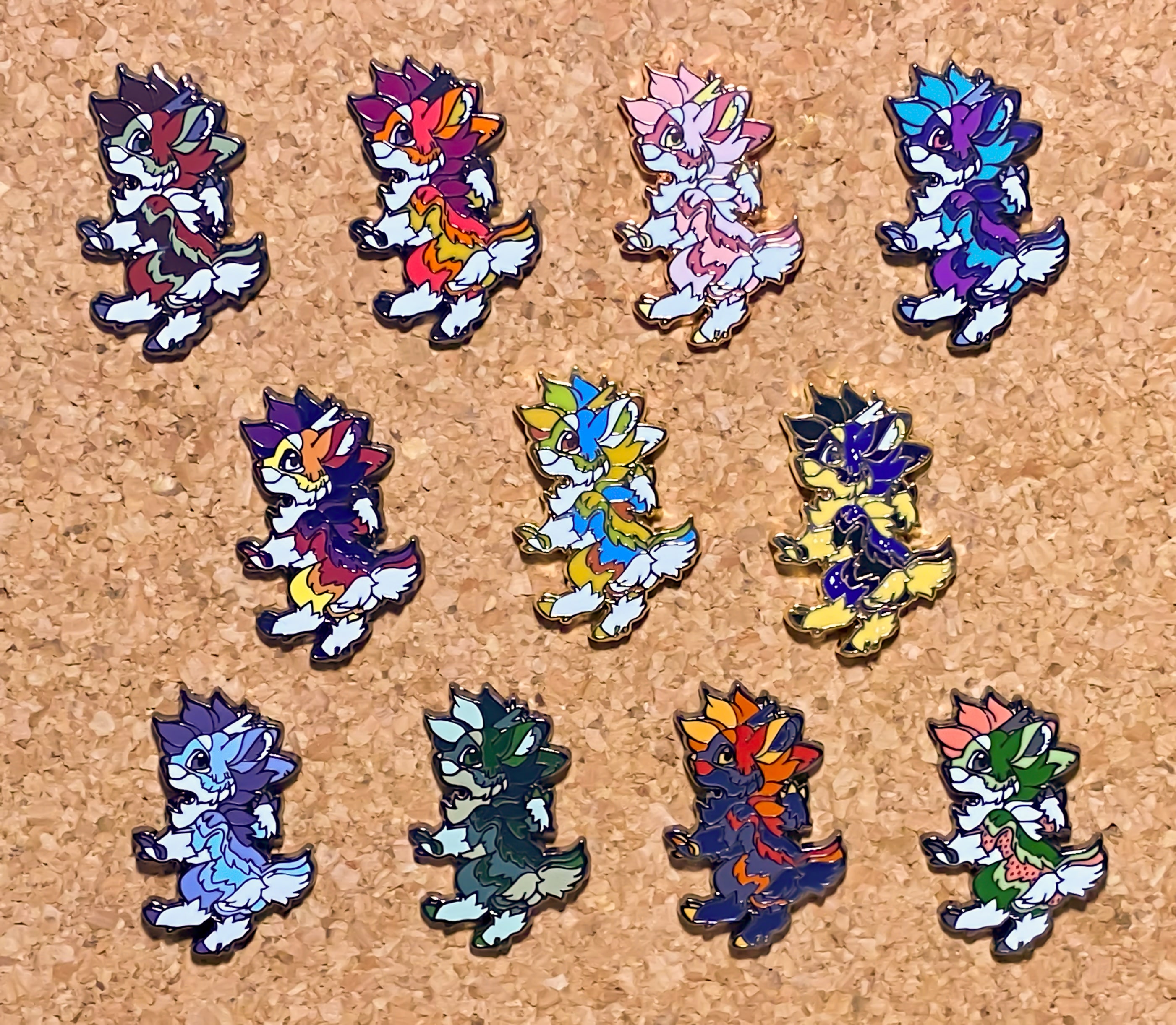 Original pin art was made by Eagli at Fursona Pins; the other color variations were made by: