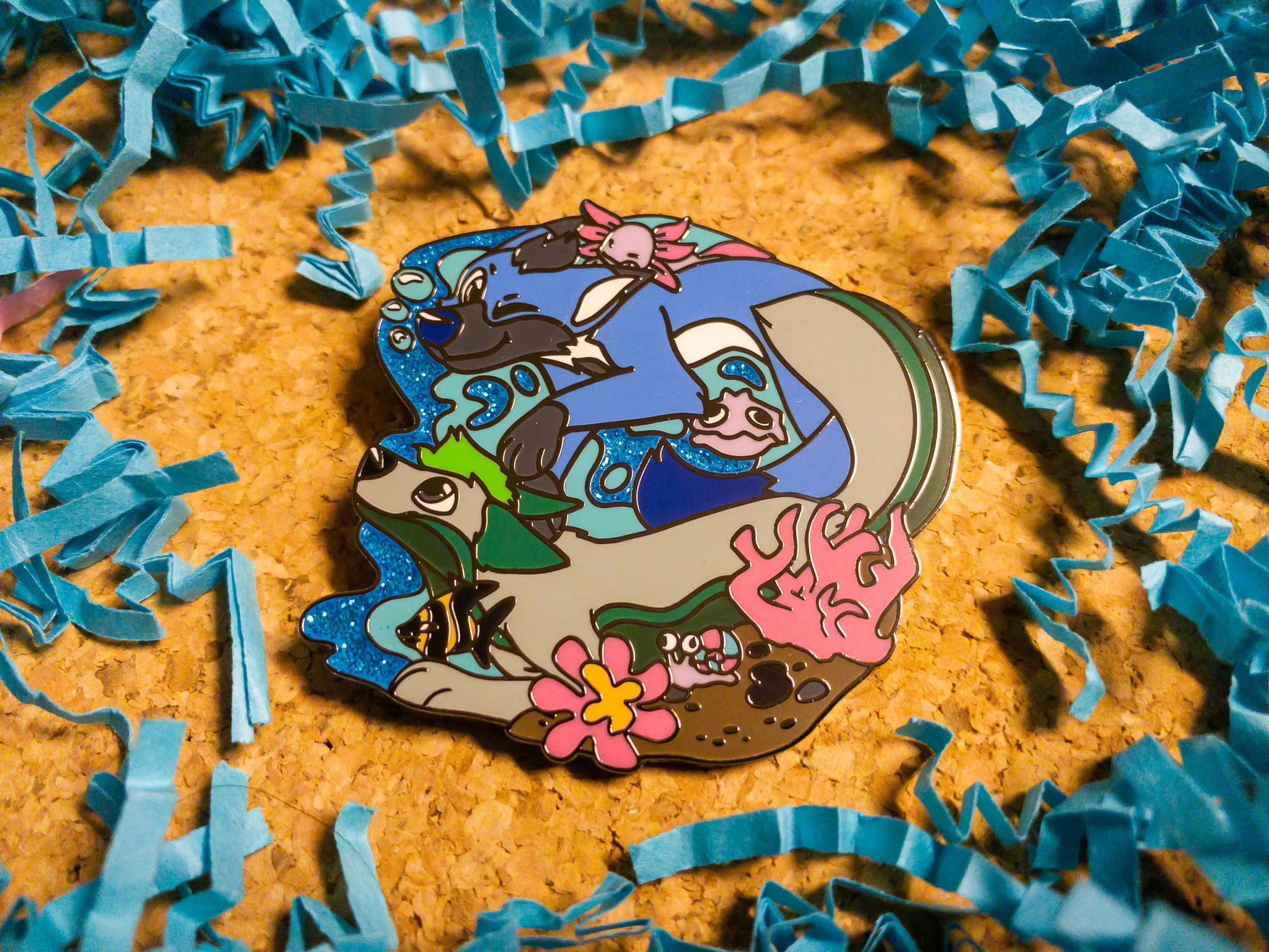 This pin features myself and the adorable wolf, Umbra! We are swimming and exploring the wonderful ocean (as you can see, we made some friends!) — now, we want to swim into your pin collection!